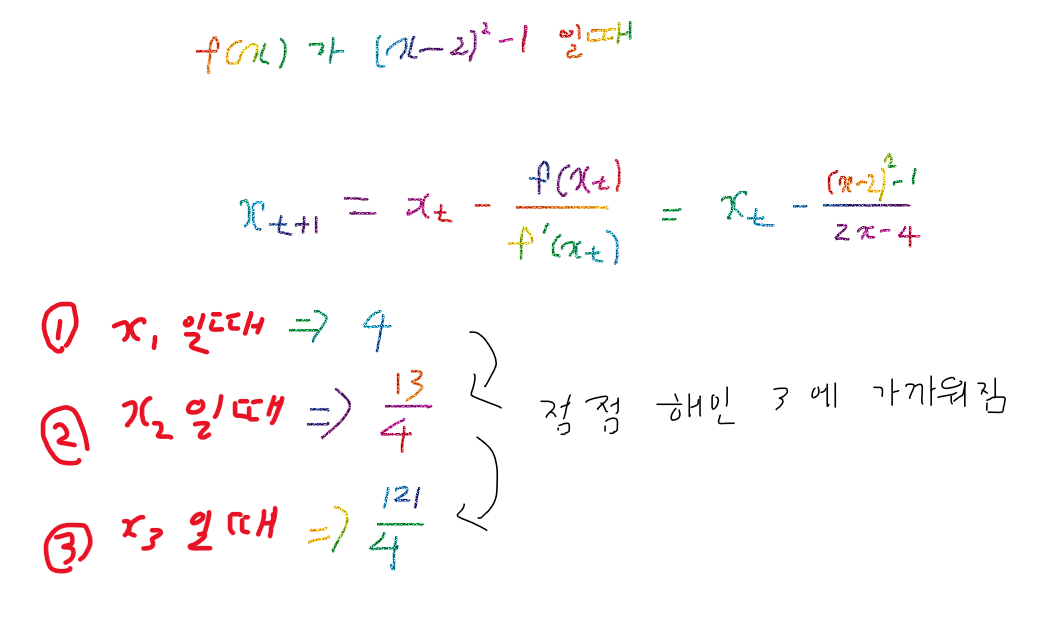 Newton Method는 이와 같이 테일러전개식을 활용해 특정위치 a 에서부터 해를 찾을때까지 1차함수로 근사한다.