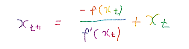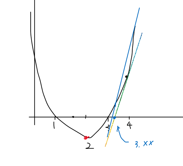 이 때, 해를 찾기 위해서는 다음과 같이 테일러 전개식을 이용한 1차함수가 0이 될때이다.