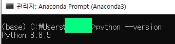 Anaconda Prompt를 들어간 후 파이썬이 제대로 설치 되었는지 확인합니다.