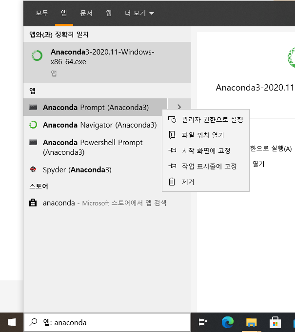 요런식으로 윈도우 검색창에 anaconda 입력 후 '앱' 탭으로 가신다음 Anaconda Prompt를 우클릭하셔서