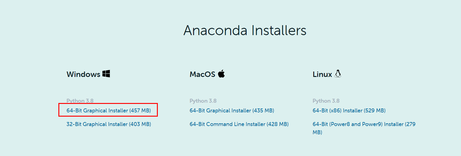 아나콘다 다운로드 페이지에 들어가서 64-Bit installer를 다운로드 한 뒤 설치합니다.