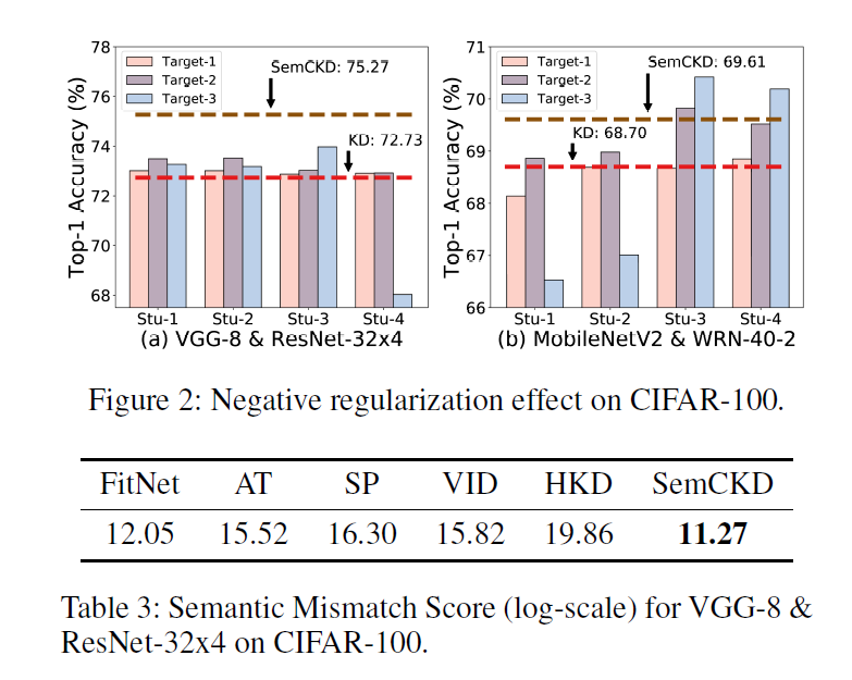 Figure 2는 teacher $ student model의 조합을 다르게 하여 임의적으로 distillation하는 경우 negative regularization효과가 극대화 됨을 나타냄. 결과적으로 잘못된 layer matching은 기본적인 KD보다 성능이 나빠질 수 있음을 시각화하여 보여줌.