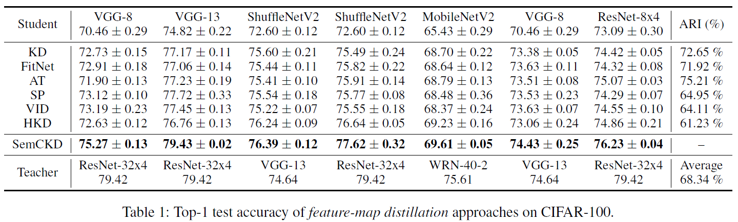 SemCKD를 활용한 method는 teacher model과 student model 구조를 갖는 다양한 모델들에 비해 월등한 성능향상 효과를 보이며 STOA성능을 달성함.