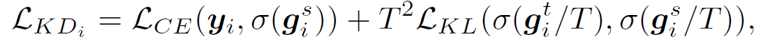 $L_{CE}$는 label과의 지도학습에 해당하며, $L_{KL}$은 teacher model의 output $\sigma(g_{i}^t/T)$과 student model의 output $\sigma(g_{i}^s/T)$간 kullback-leibler divergence loss를 의미함. T는 temperature로 teacher model의 output값을 smoothing하는 역할을 함.