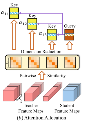 이러한 input을 통해 dot product attention을 수행함으로써 query에 해당하는 student feature map은 모든 teacher feature map들과의 pairwise similarity를 계산할 수있음. 각각의 계산된 similarity 값은 softmax함수를 거쳐 저장됨.