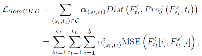 이어서 본 논문에서는 feature distillation에 해당하는 $L_{FMD}$를 $L_{SemCKD}$로 새롭게 제안함.