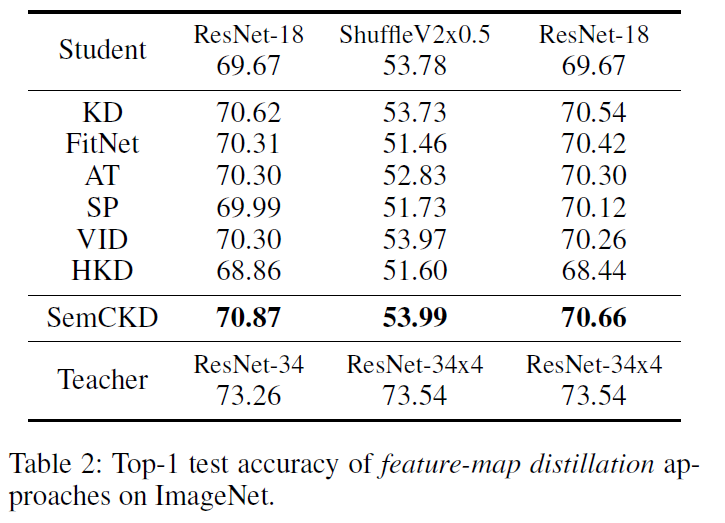 3. CIFAR-100 및 ImageNet 실험결과 SemCKD는 전반적으로 향상된 성능을 보이며 SOTA를 달성함.