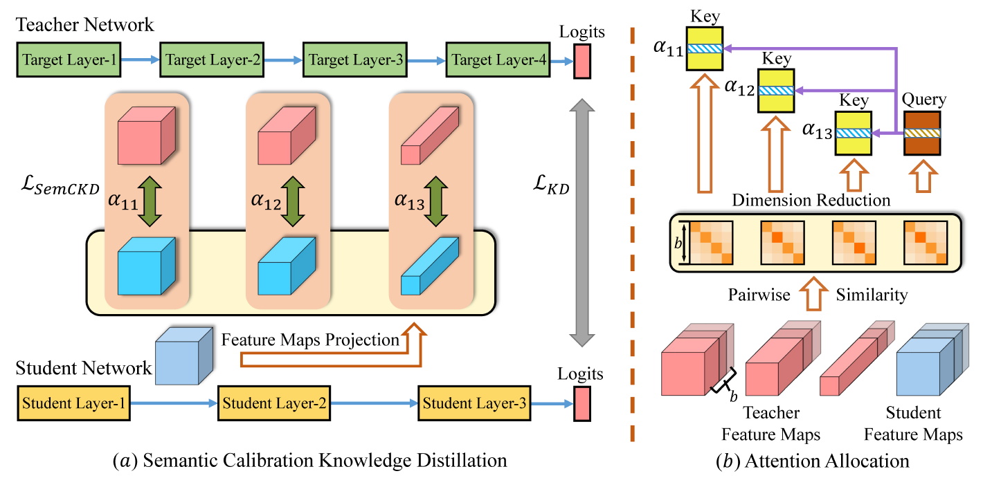 따라서 본 논문에서는 보다 효율적이고 flexible하게 feature map을 지식전이하는 접근을 하며, Semantic Calibation for Cross-layer Knowledge Distillation (SemCKD)를 제안함.