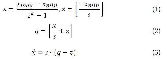 1번 수식은 zero-point $z$로부터 최솟값과 최댓값을 뺀 범위(range)를 scaling 하는 수식이며, 이 과정을 거친 후, 수식 2에서는 floating value를 integer valu $q$로 변환하는 과정을 거침. 마지막으로, quantized integer $q$를 다시 reconstruction 하기 위해 수식 3과 같은 dequantization과정을 거침.
