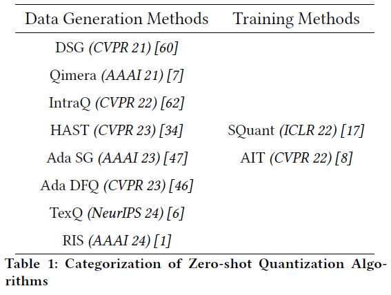 최근 연구로는 이러한 데이터 합성분야에 초점을 두어 활발한 연구가 진행되고 있으며, ZSQ분야의 Quantization 연구는 표 1과 같이 정리할 수 있음.