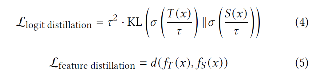 기본적으로 knowledge distillation은 logit distillation만 활용하며, feature distillation은 logit distillation에 추가적으로 활용함. logit distillation과 feature distillation 수식은 아래와 같음.