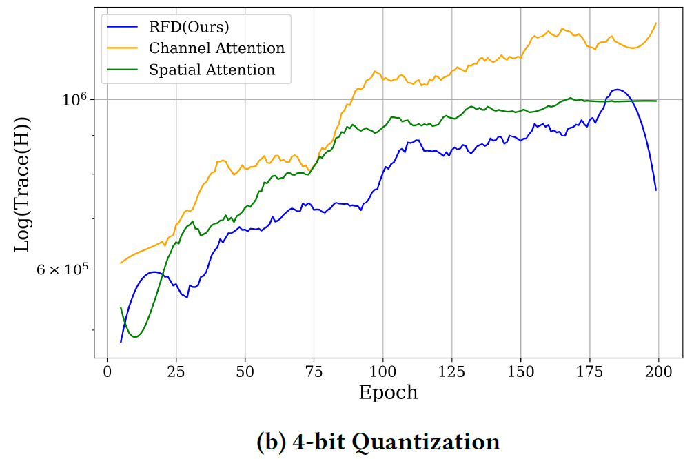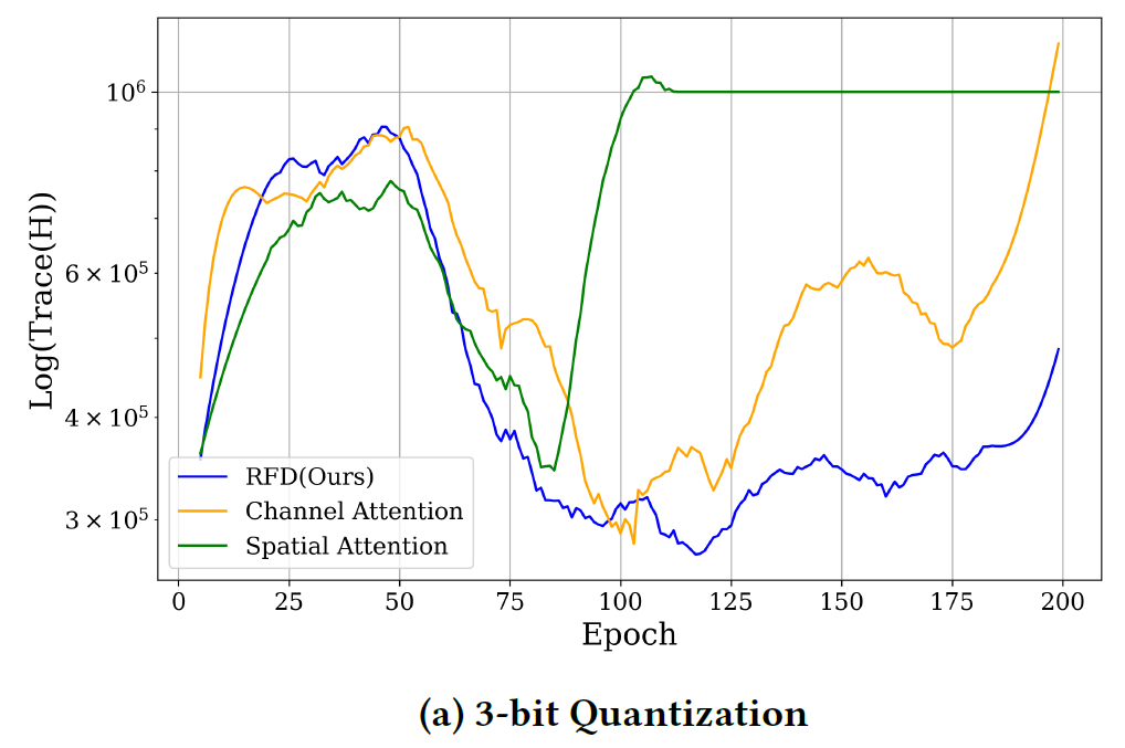 특히, 3-bit 환경에서는 100 epoch 이후로 기존 방식들은 급격하게 불안정한 학습이 되는 경향을 보이지만, RFD loss를 활용하는 경우에는 매우 안정적인 학습이 진행됨을 확인할 수 있음.
