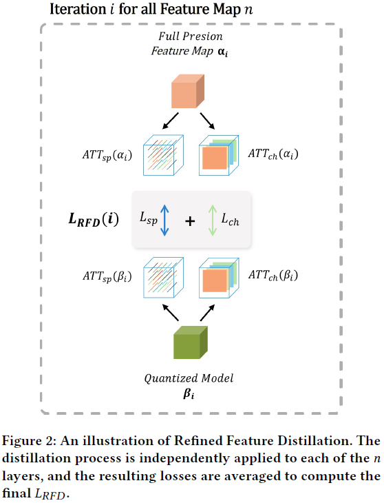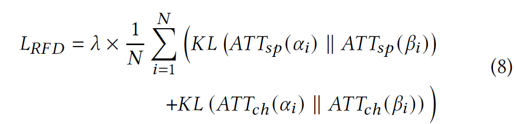 수식 8과 그림 2는 각 layer의 feature map마다 $L_RFD$를 계산하는 과정에 해당함. 수식에서 첫 번째 $KL()$은 teacher model과 student model로부터 분해된 spatial attention map을 비교해서 차이를 최소화하는 과정이며, 두 번째 $KL()$은 channel 단위의 attention map을 비교함. 이러한 과정을 $N$개의 feature map ($N$개의 layer) 만큼 반복하고 평균을 구함으로써 최종적인 $L_RFD$를 계산할 수 있음.