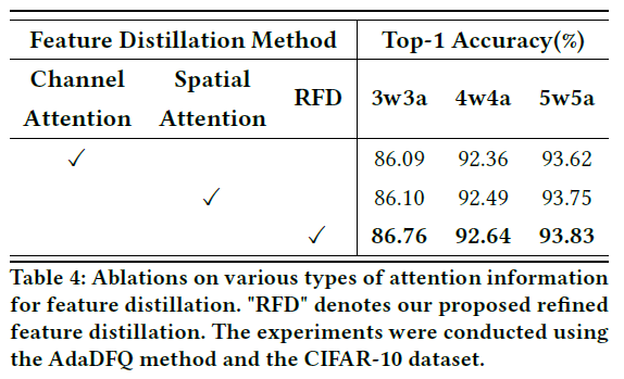 RFD Loss의 효과를 분석하기 위해 논문에서는 추가적인 ablation study를 진행함. Table 4는 attention 정보에 따른 정확도임.