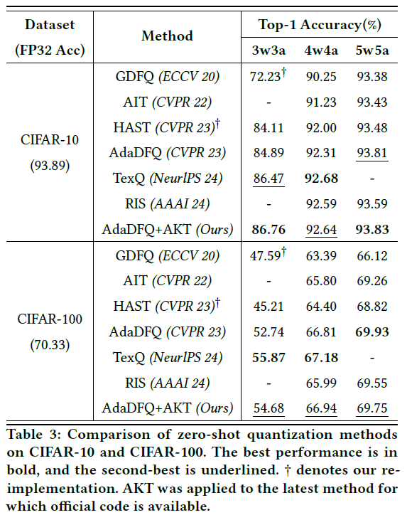 Data generation method인 GDFQ와 HAST, AdaDFQ에 본 논문의 제안방식인 AKT를 적용하여 학습하는 경우 거의 모든 경우에서 정확도 향상의 효과를 볼 수 있었으며, 특히 AdaDFQ에 AKT를 적용하였을 때 3-bit환경에서 매우 큰 성능향상이 일어났음을 확인할 수 있음.