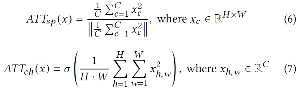 $x, C, H, W$는 각각 feature map, channel, height, width를 의미하며, $x^2$는 feature map을 제곱한 값을 의미함. 제곱을 하는 이유는 feature 값을 강조하여 반영하기 위함임.