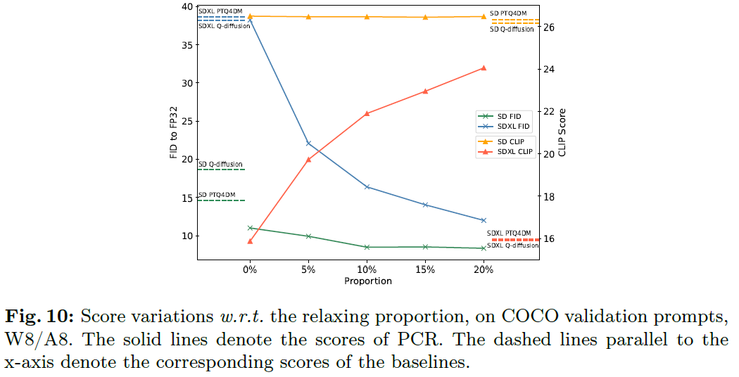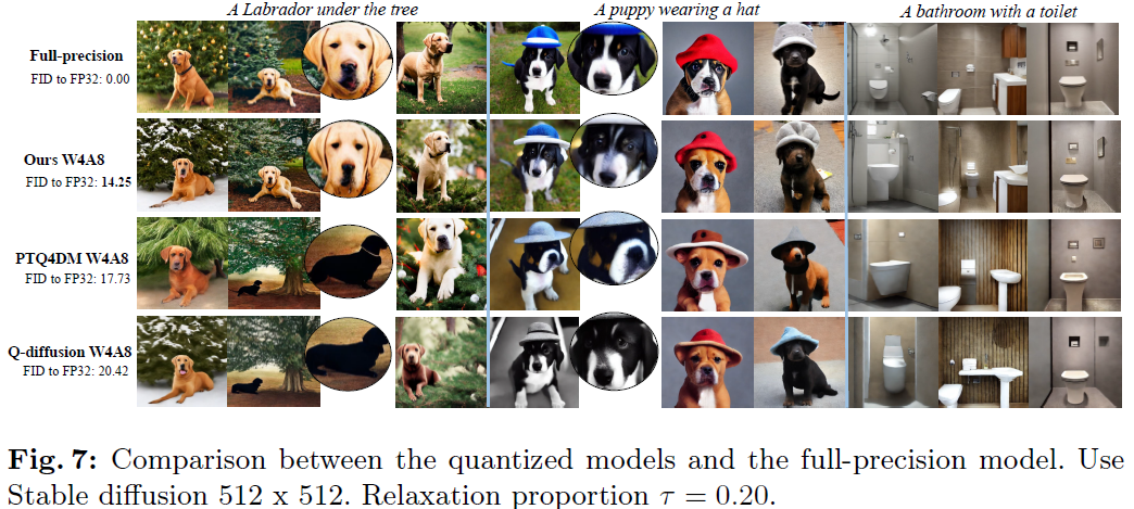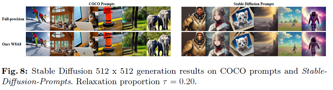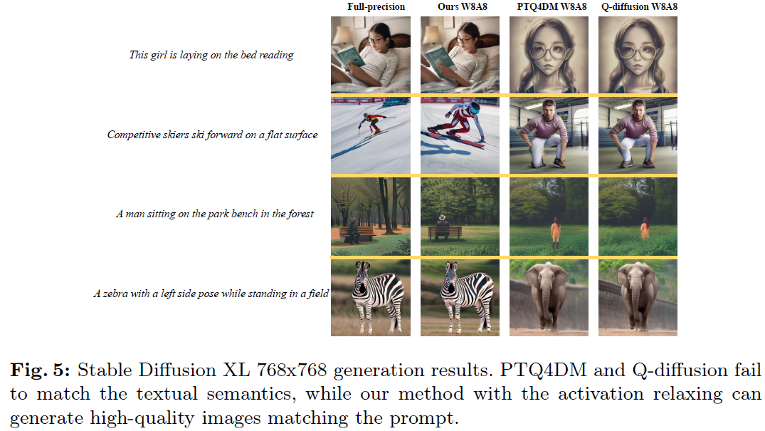 위 Figure와 같이 본 논문의 방식의 8bit quantization은 FP Image와 거의 동일한 이미지를 생성하지만, 타 모델의 8bit quantization에서는 이미지 매칭이 좋지 않고, prompt와 맞지 않는 이미지를 생성함.