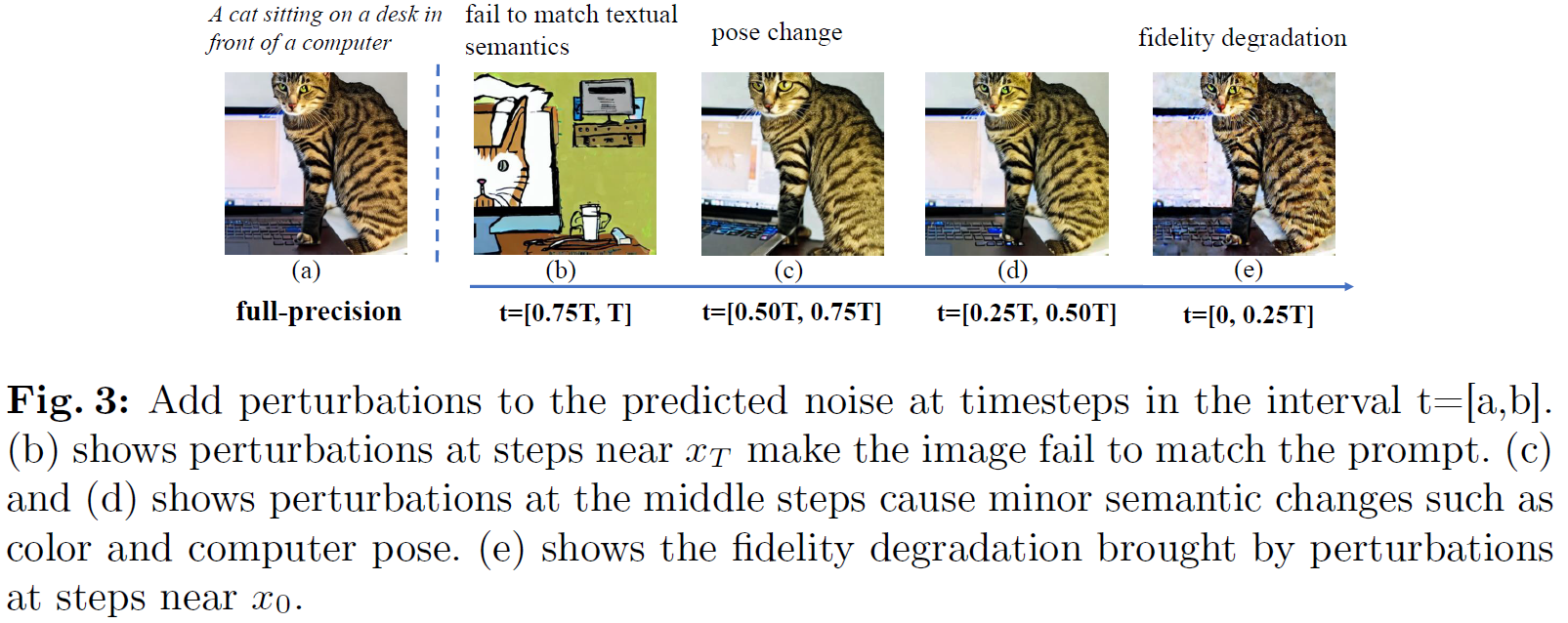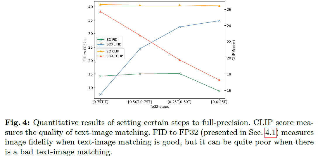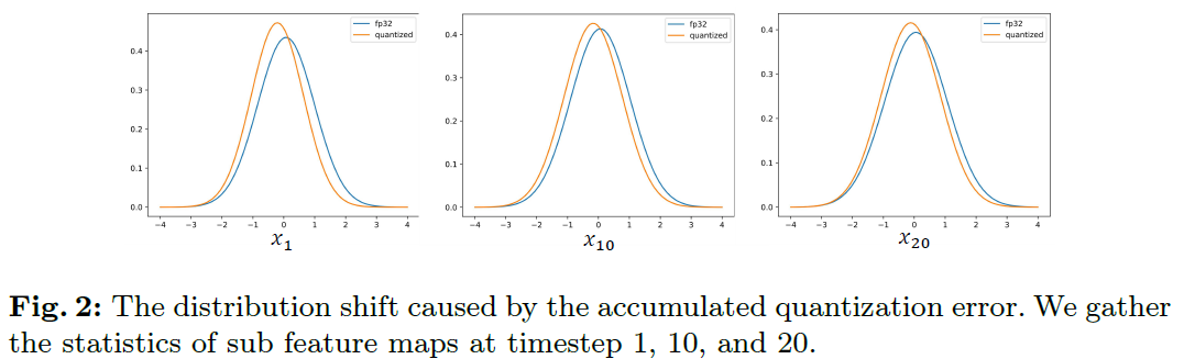 본 논문에서는 증명을 통해 denoising step의 quantization error누적이 최종 생성이미지에 직접 영향을 준다는 분석을 진행하였으며, image fidelity와 text-image matching이 timestep에 따라 다르다는 것을 실험적으로 관찰함.