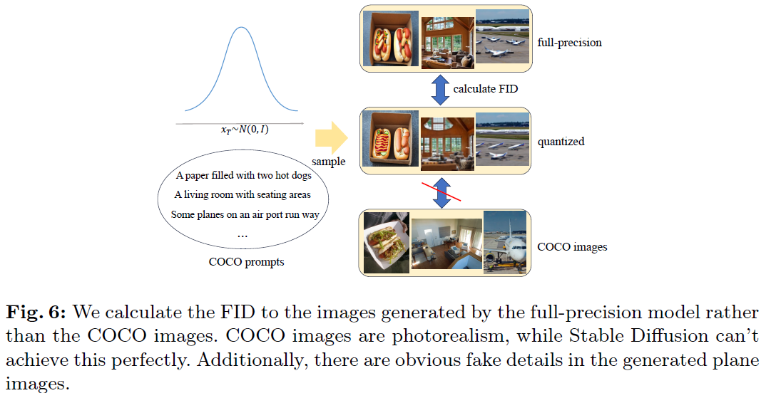 실험은 COCO dataset으로 진행하였으며, 위 Figure와 같이 원본 COCO image와 quantized diffusion모델이 생성한 이미지를 비교하는 것 대신, Full-precision(원본 diffusion model)에서 생성한 이미지와 quantized diffusion모델이 생성한 이미지를 비교하는 FID to FP32 평가지표를 새롭게 도입함.