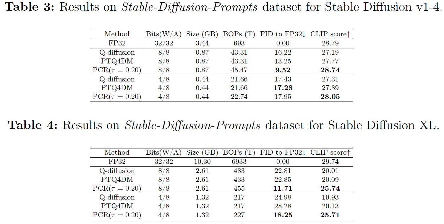 본 논문의 방식은 Stable Diffusion과 Stable Diffusion XL에서 우수한 성능을 보이며, Stable Diffusion XL에 대해 최초로 양자화를 진행하였음.