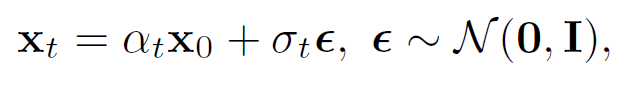 Forward 과정에서는 원본이미지에 noise를 추가하는 과정임. 여기서 $x_0$는 원본이미지이고, $x_t$는 noise가 추가된 이미지임. 여기서 $\alpha_t$와 $\sigma_t$를 통해 noise를 추가함.