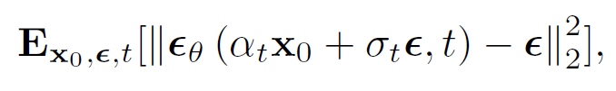 Reverse 과정에서는 위와 같은 loss를 기반으로 진행됨. 여기서 $\alpha_t x_0 + \sigma_t \epsilon, t$는 noise를 추가한 이미지의 예측값이며, $\epsilon$은 noise vector를 의미함. 이 두 값을 $L_2 norm$ 기반으로 하여 학습을 진행할 수 있음.