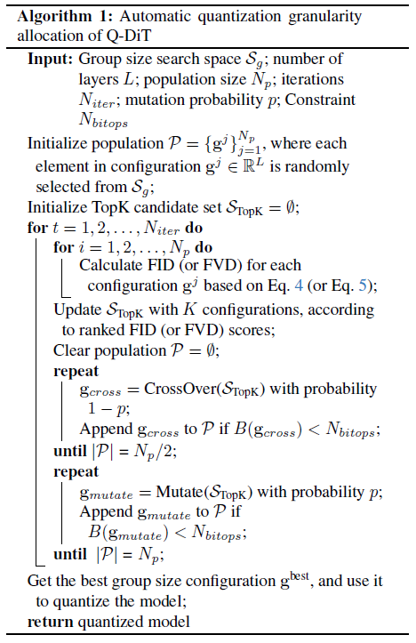 2) 여러번의 iteration 중 각 iteration마다의 각 group size에 대해 (for문 2개) 양자화된 모델을 생성함. 그 후, 모델이 생성한 이미지나 영상에 대해 위 수식을 기반으로 점수를 계산함. 계산된 결과를 바탕으로 가장 성능 좋은 K개의 조합만 골라 TopK 후보 세트에 저장