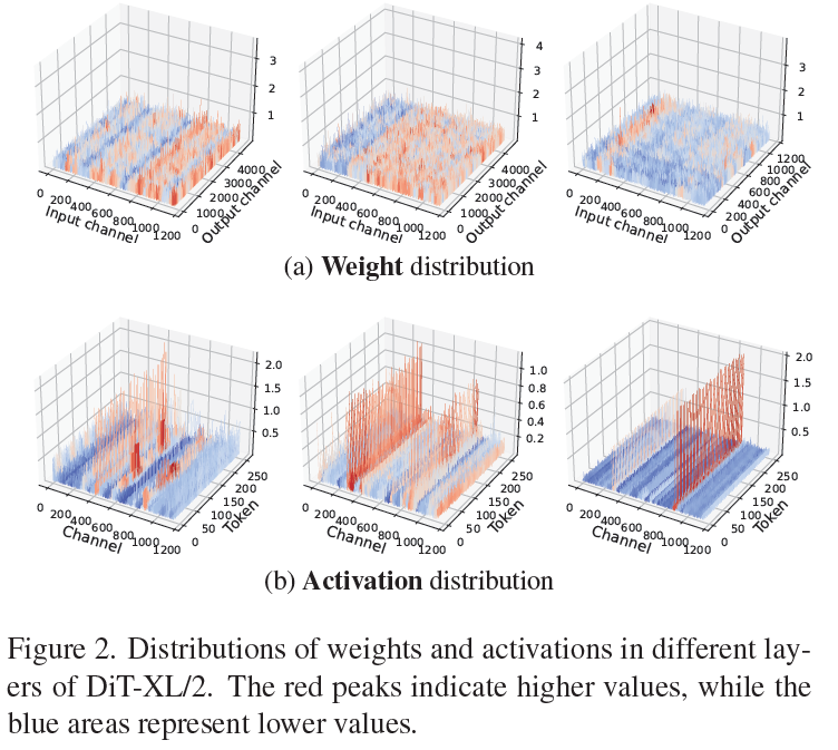 DiT는 입력 채널 간 weight 및 activation 분산이 매우 큼.