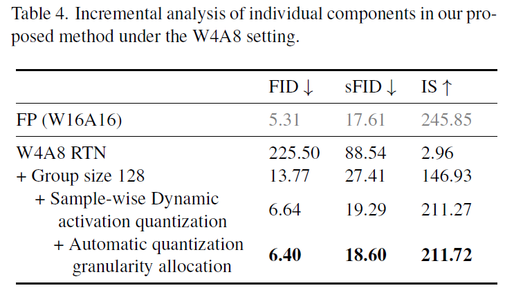 Table 4를 보면, RTN(round to nearest) → group quantization → dynamic activation → group size search(제안방식) 순으로 성능이 점진적으로 향상됨.