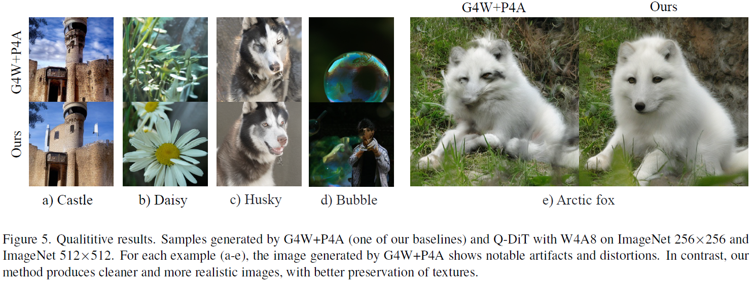 실제로, ImageNet 256×256 데이터셋에서 W4A8로 양자화했을 때, 기존 full-precision 모델 대비 FID 손실이 1.09 증가에 불과할 정도로 성능 저하가 거의 없는 near-lossless quantization을 달성함.