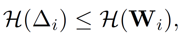 직관적으로 보았을 때 quantization은 다대일 매핑으로 이루어지고, $\triangle_i$에 대한 information entropy(무작위성)는 항상 weight $W_i$보다 작을 수 밖에 없음.