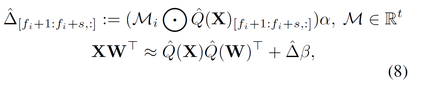 feature 축만 보는 수식7과 달리 수식8은 token축의 정보 (시간 및 공간)를 반영함. 여기서 $\mathcal{M}$은 frame별 scalar gate를 의미하며, frame별로 $\mathcal{M}_i$로 quantized activation인 $\hat{Q}(X)$를 스케일링한 후 $\alpha$를 곱함.