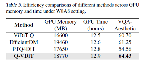 메모리 사용 측면에서도 Q-VDiT은 최소한의 paramter 추가로 gpu time과 memory 소비를 최대한 막으면서도 우수한 성능을 도출함.