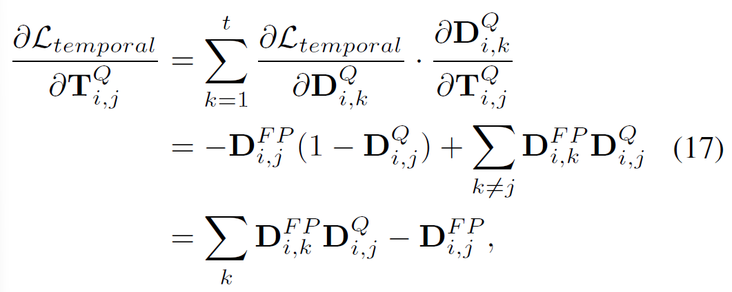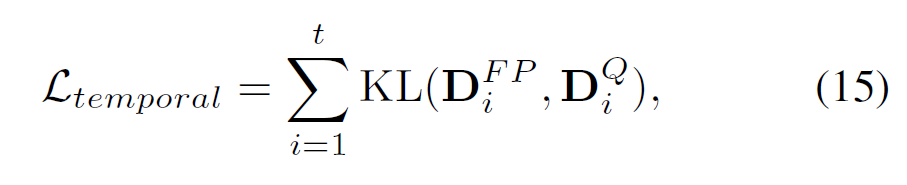 softmax를 취한 값들은 수식 15와 같이 KL 발산을 통해 두 분포를 맞추는 과정을 거침. 이를 통해 frame $i$ 최적화 시 다른 모든 frame간 관계까지 동시에 고려할 수 있으며, global한 시간구조를 보존하는 방향으로 학습을 유도함.