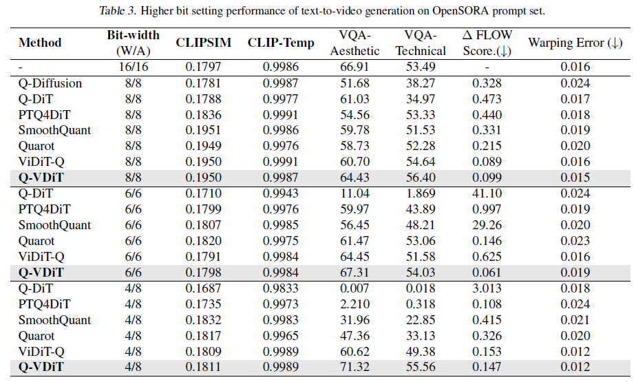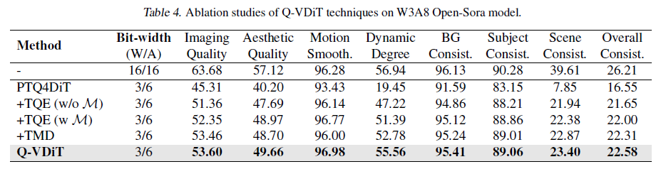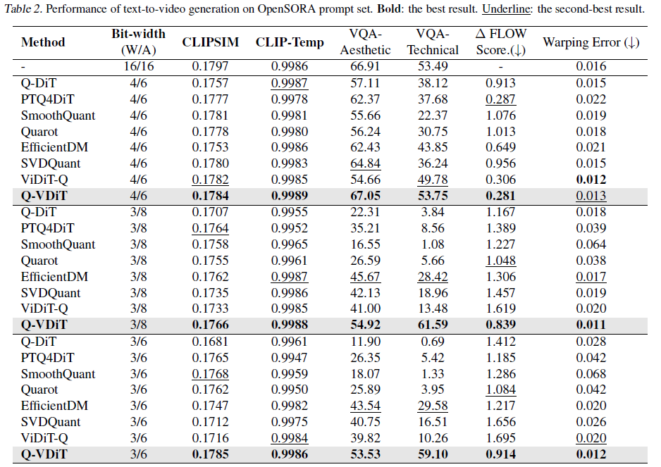 실험결과, Q-VDiT는 3비트 weight 6비트 activation에서 SOTA성능을 달성하였으며, 가장 극단적인 압축환경에서 인상적인 성능을 보임.