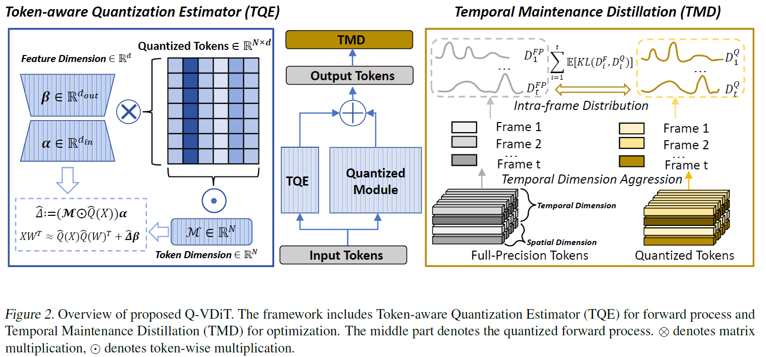 이에 대한 한계를 해결하기 위해 본 논문에서는 DiT에 특화된 quantization기법인 Q-VDiT를 제안하며, Q-VDiT는 Token-aware Quantization Estimator (TQE)와 Temporal Maintenance Distillation (TMD) 기법으로 구성됨.