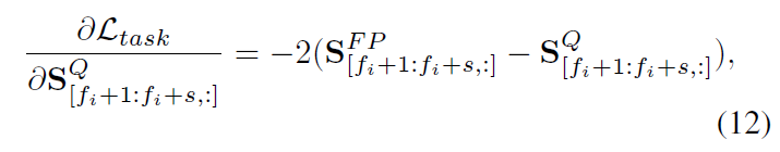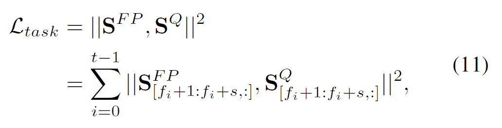 여기서 $O_{FP} \in \mathbb{R}^{n \times d}$는 FP모델의 output이며, $O_{Q} \in \mathbb{R}^{n \times d}$ 는 quantized model의 output을 의미함. 수식 상의 편의를 위해 이를 $S^{FP}$와 $S^{Q}$로 표기하며, frame 단위로 표현하면 수식11과 같음.