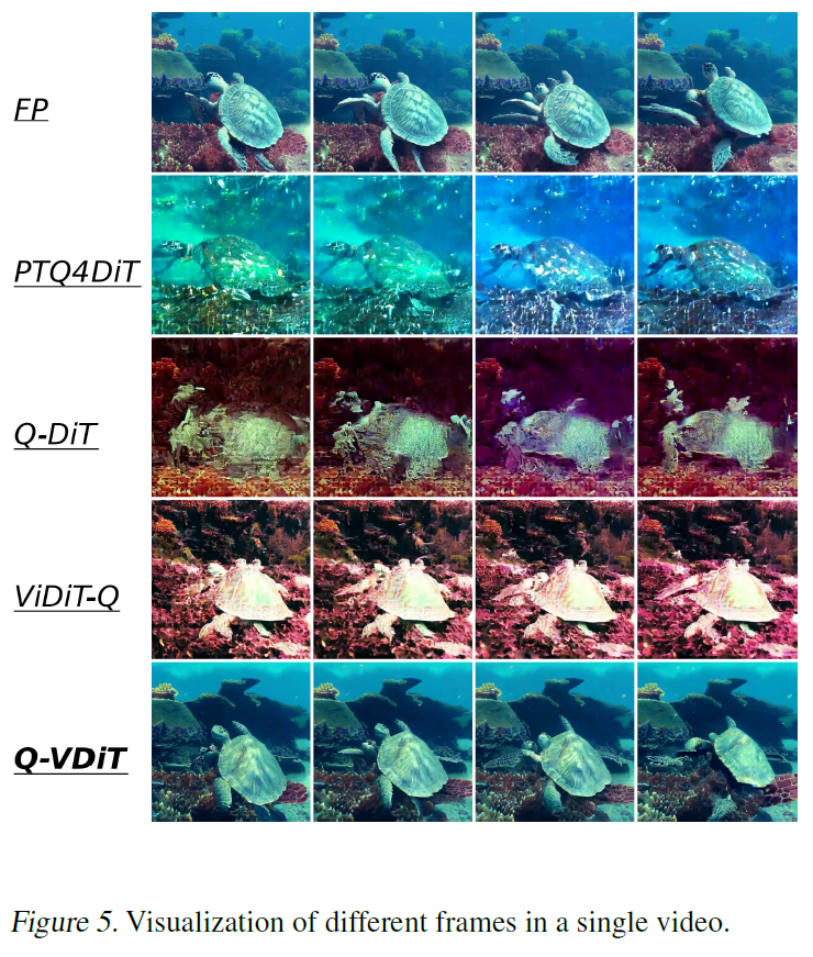 본 논문에서는 DiT에 특화된 quantization 방식인 Q-VDiT를 제안함.