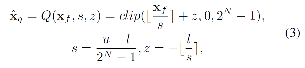 $X_f$는 원본 벡터이며, $s$는 scaling factor를 의미함. scaling factor를 원본벡터에 나눔으로써 interger값으로 치환이 가능함. $z$는 zero-point이며 원래 값의 0을 quantized 정수에서 어디에 매핑할 지 결정함. $X$는 양자화를 진행할 bit수(bit-width)를 의미함. 예를 들어 8bit 양자화를 하고 싶다면 $N$은 8이 됨.