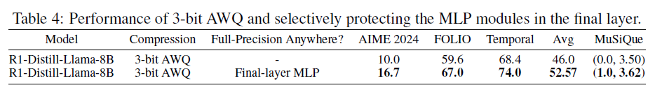 - Up-proj의 중요성을 증명하기 위해 해당 모듈 하나면 3-bit로 quantization하는 실험을 진행한 결과, 전체 평균 정확도 16.3%나 하락함. 이는 해당 가중치가 reasoning에 필수적인 역할을 한다는 점을 실증적으로 검증함