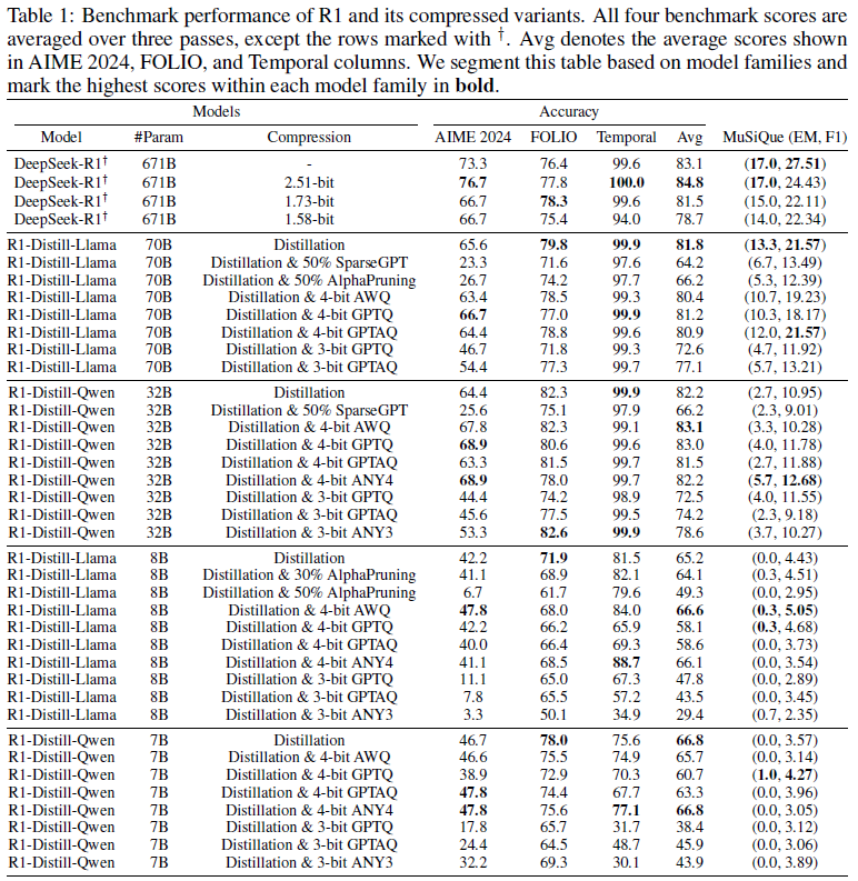 - 압축기법 간 비교: 2.51-bit Dynamic Quantization이 압축률이 상대적으로 낮기 때문에 전체 평균 정확도 측면에서도 가장 우수한 성능, distillation모델인 Llama-70B와 Qwen-32B 역시 원본 R1에 근접한 높은 성능 - Pruning의 치명적 결함 존재